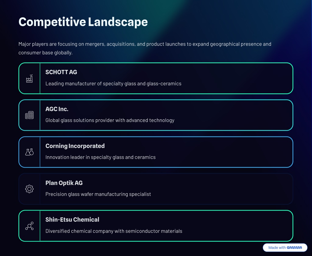 8. Competitive Landscape Major players are focusing on mergers, acquisitions, and product launches to expand geographical presence and consumer base globally. SCHOTT AG Leading manufacturer of specialty glass and glass-ceramics AGC Inc. Global glass solutions provider with advanced technology Corning Incorporated Innovation leader in specialty glass and ceramics Plan Optik AG Precision glass wafer manufacturing specialist Shin-Etsu Chemical Diversified chemical company with semiconductor materials
