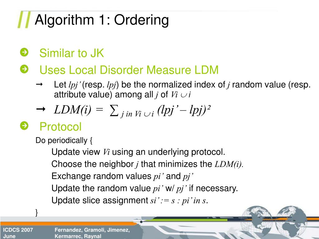 Fernandez, Gramoli, Jimenez, Kermarrec, Raynal Algorithm 1: Ordering • Similar to JK • Uses Local Disorder Measure LDM • Letlpj’(resp.lpj) be the normalized index ofj random value(resp. attribute value) among all j of Vi i • LDM(i) = ∑j in Vi i (lpj’ – lpj)² • Protocol Do periodically { • Update view Vi using an underlying protocol. • Choose the neighbor j that minimizes the LDM(i). • Exchange random values pi’ and pj’. • Update the random value pi’ w/ pj’ if necessary. • Update slice assignment si’ := s : pi’ in s. } Difference with JK