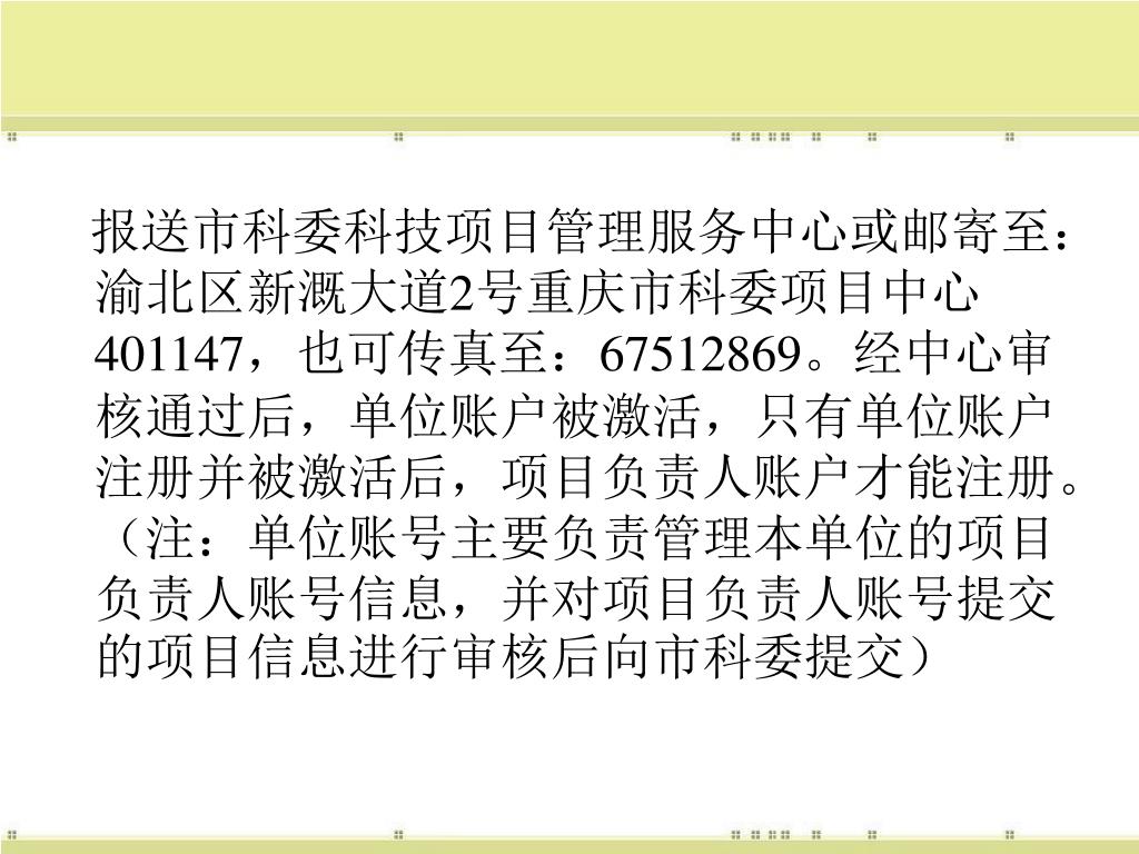 申报说明 1、注册 重庆市科技计划项目注册账户分为2类:单位账户和项目负责人账户。 单位账户:针对项目申报单位设立的账户。项目申报单位登录市科委门户网站http://www.cstc.gov.cn,点击“网上办公”目录下“在线申报”链接,进入“科技计划网上申报系统”首页,点击页面右下角“单位注册”进入申报单位基本信息注册程序,如实填写单位基本信息并网上提交,根据系统提示打印单位注册信息后加盖本单位公章。