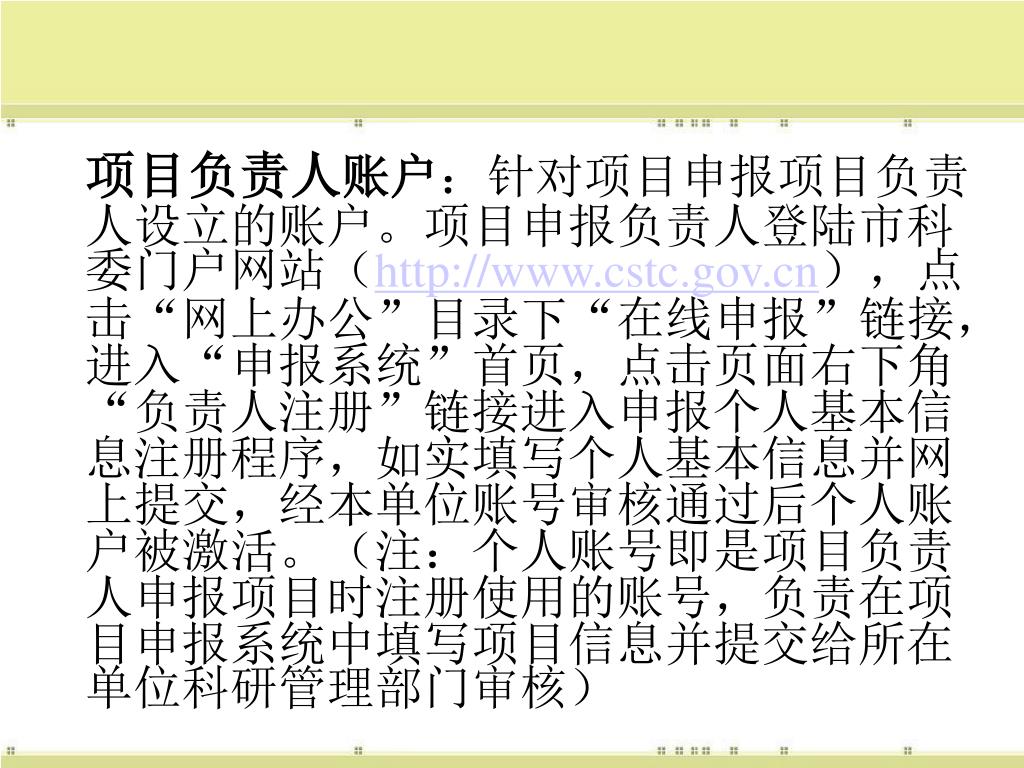 项目负责人账户:针对项目申报项目负责人设立的账户。项目申报负责人登陆市科委门户网站(http://www.cstc.gov.cn),点击“网上办公”目录下“在线申报”链接,进入“申报系统”首页,点击页面右下角“负责人注册”链接进入申报个人基本信息注册程序,如实填写个人基本信息并网上提交,经本单位账号审核通过后个人账户被激活。(注:个人账号即是项目负责人申报项目时注册使用的账号,负责在项目申报系统中填写项目信息并提交给所在单位科研管理部门审核) 项目负责人账户:针对项目申报项目负责人设立的账户。项目申报负责人登陆市科委门户网站(http://www.cstc.gov.cn),点击“网上办公”目录下“在线申报”链接,进入“申报系统”首页,点击页面右下角“负责人注册”链接进入申报个人基本信息注册程序,如实填写个人基本信息并网上提交,经本单位账号审核通过后个人账户被激活。(注:个人账号即是项目负责人申报项目时注册使用的账号,负责在项目申报系统中填写项目信息并提交给所在单位科研管理部门审核)