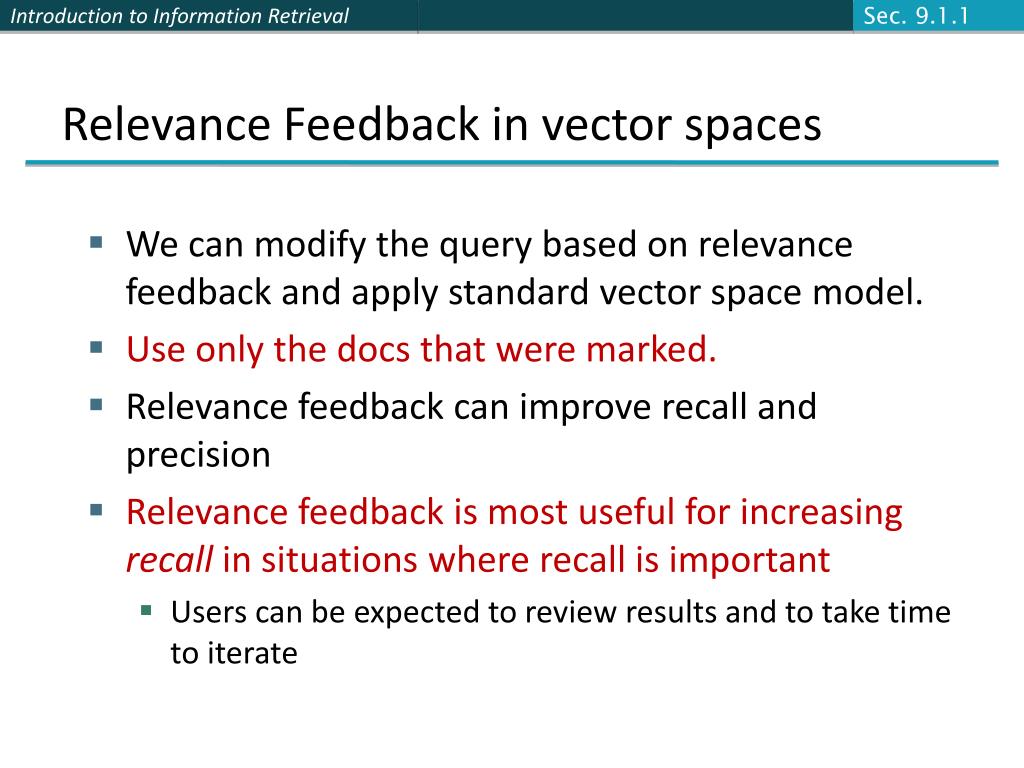 Sec. 9.1.1 Relevance Feedback in vector spaces • We can modify the query based on relevance feedback and apply standard vector space model. • Use only the docs that were marked. • Relevance feedback can improve recall and precision • Relevance feedback is most useful for increasing recall in situations where recall is important • Users can be expected to review results and to take time to iterate