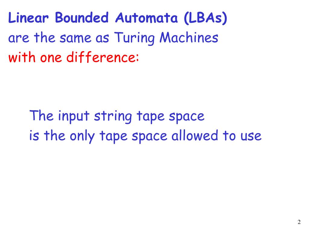 Linear Bounded Automata LBAs. Linear Bounded Automata (LBAs) are the same as Turing Machines with one difference:. The input string tape space is the only tape space allowed to use. Linear Bounded Automaton (LBA). Input string. Working space in tape. Left-end marker. Right-end marker.