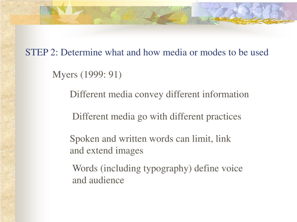 STEP 2: Determine what and how media or modes to be used Myers (1999: 91) Different media convey different information Different media go with different practices Spoken and written words can limit, link and extend images Words (including typography) define voice and audience
