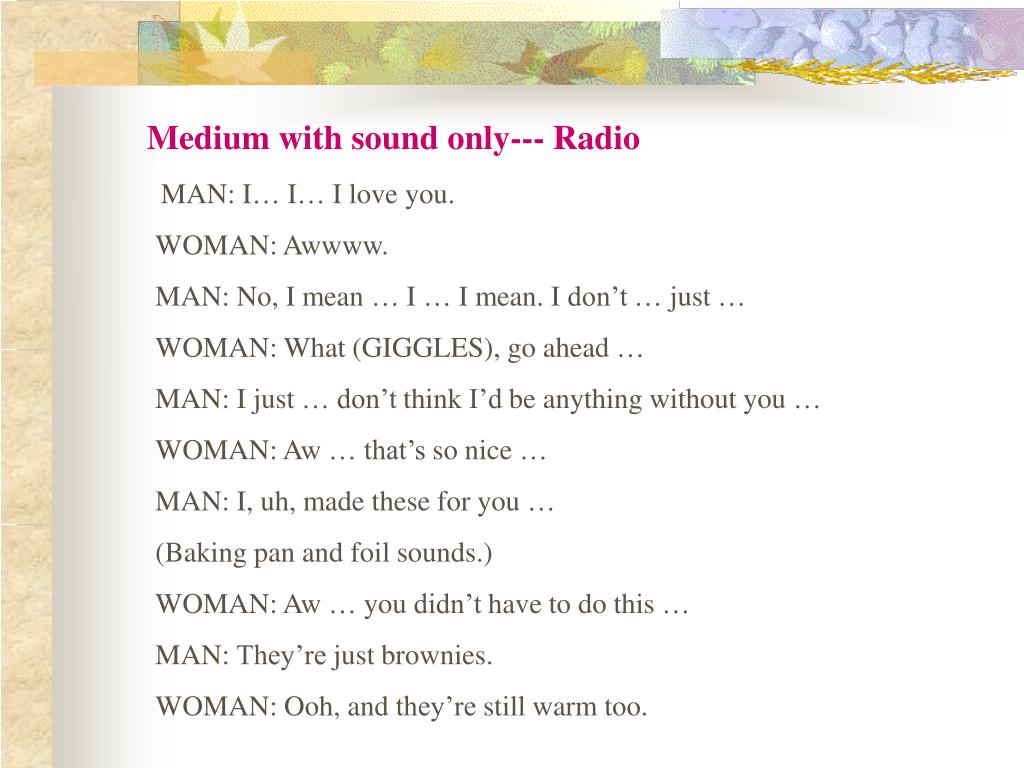 Medium with sound only--- Radio MAN: I… I… I love you. WOMAN: Awwww. MAN: No, I mean … I … I mean. I don’t … just … WOMAN: What (GIGGLES), go ahead … MAN: I just … don’t think I’d be anything without you … WOMAN: Aw … that’s so nice … MAN: I, uh, made these for you … (Baking pan and foil sounds.) WOMAN: Aw … you didn’t have to do this … MAN: They’re just brownies. WOMAN: Ooh, and they’re still warm too.