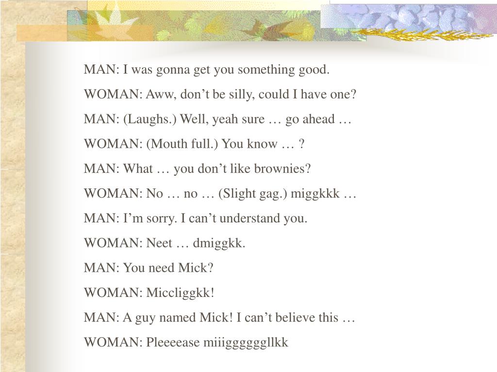 MAN: I was gonna get you something good. WOMAN: Aww, don’t be silly, could I have one? MAN: (Laughs.) Well, yeah sure … go ahead … WOMAN: (Mouth full.) You know … ? MAN: What … you don’t like brownies? WOMAN: No … no … (Slight gag.) miggkkk … MAN: I’m sorry. I can’t understand you. WOMAN: Neet … dmiggkk. MAN: You need Mick? WOMAN: Miccliggkk! MAN: A guy named Mick! I can’t believe this … WOMAN: Pleeeease miiiggggggllkk
