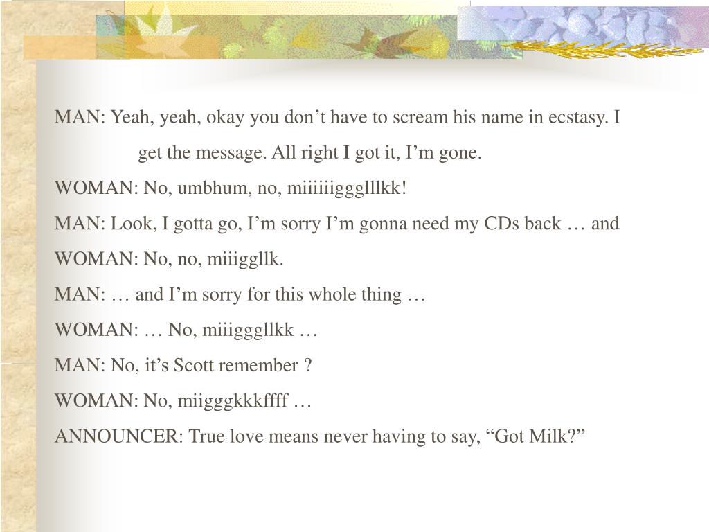MAN: Yeah, yeah, okay you don’t have to scream his name in ecstasy. I get the message. All right I got it, I’m gone. WOMAN: No, umbhum, no, miiiiiiggglllkk! MAN: Look, I gotta go, I’m sorry I’m gonna need my CDs back … and WOMAN: No, no, miiiggllk. MAN: … and I’m sorry for this whole thing … WOMAN: … No, miiigggllkk … MAN: No, it’s Scott remember ? WOMAN: No, miigggkkkffff … ANNOUNCER: True love means never having to say, “Got Milk?”