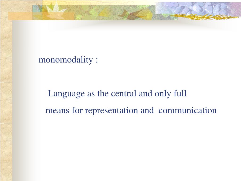 means of expression (material and other technologies) multimodality When humans converse with one another, we utilize a wide array of mediato interact, including spoken language, gestures, and drawings. We exploit multiple human sensory systems or modes of communication, including vision, audition, and taction. the manner of expression