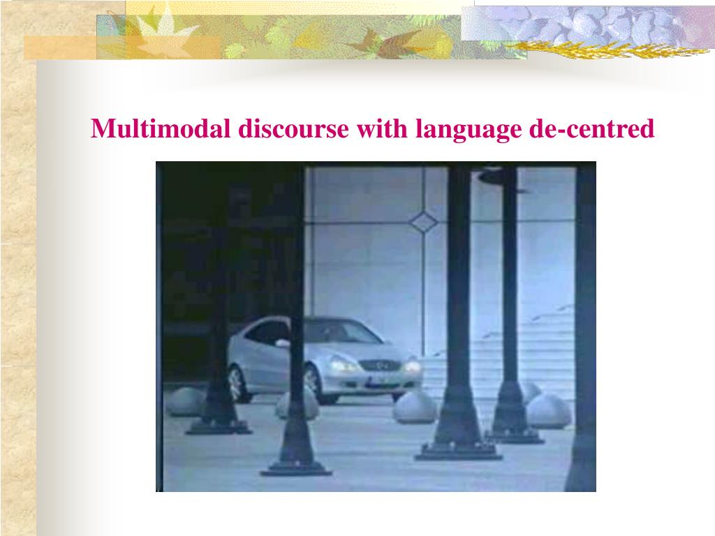 I. What is multimodal discourse Multimodal discourse is defined as“the use of several semiotic modes in the design of a semiotic product or event, together with the particular way in which these modes are combined”– they may for instance reinforce each other (‘say the same thing in different ways’), fulfil complementary roles, or be hierarchically ordered, as in action films, where action is dominant, with music adding a touch of emotive colour and sync sound a touch of realistic ‘presence’ (Kress G. & Van Leeuwen, T, 1996, 2001; Batesman et al., 2002)