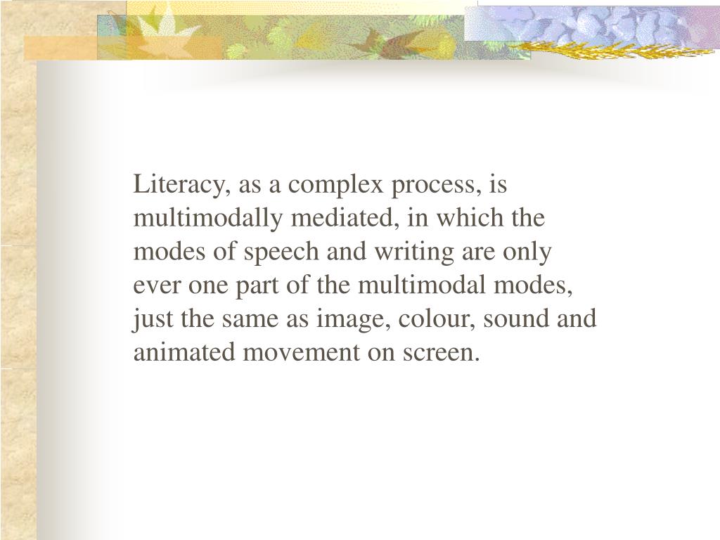 Literacy, as a complex process, is multimodally mediated, in which the modes of speech and writing are only ever one part of the multimodal modes, just the same as image, colour, sound and animated movement on screen.