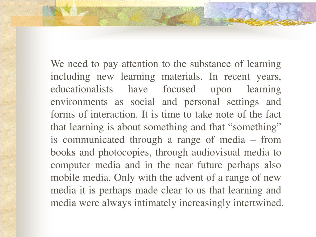 We need to pay attention to the substance of learning including new learning materials. In recent years, educationalists have focused upon learning environments as social and personal settings and forms of interaction. It is time to take note of the fact that learning is about something and that “something” is communicated through a range of media – from books and photocopies, through audiovisual media to computer media and in the near future perhaps also mobile media. Only with the advent of a range of new media it is perhaps made clear to us that learning and media were always intimately increasingly intertwined.