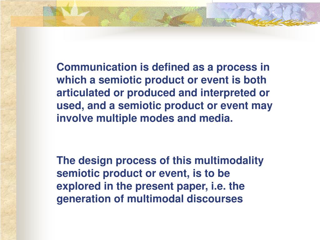 Communication is defined as a process in which a semiotic product or event is both articulated or produced and interpreted or used, and a semiotic product or event may involve multiple modes and media. The design process of this multimodality semiotic product or event, is to be explored in the present paper, i.e. the generation of multimodal discourses