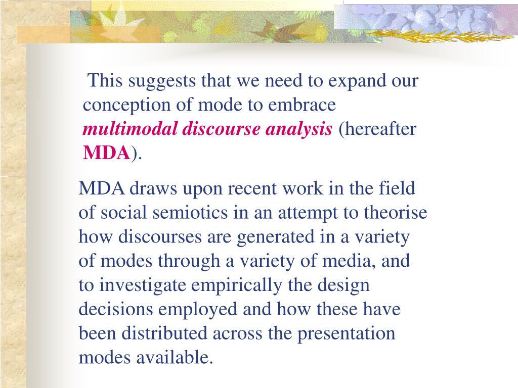 This suggests that we need to expand our conception of mode to embrace multimodal discourse analysis (hereafter MDA). MDA draws upon recent work in the field of social semiotics in an attempt to theorise how discourses are generated in a variety of modes through a variety of media, and to investigate empirically the design decisions employed and how these have been distributed across the presentation modes available.