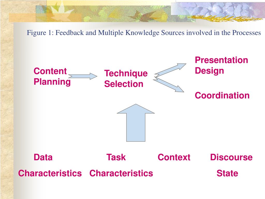 Figure 1: Feedback and Multiple Knowledge Sources involved in the Processes Presentation Design Content Planning Technique Selection Coordination Data Task Context Discourse Characteristics Characteristics State