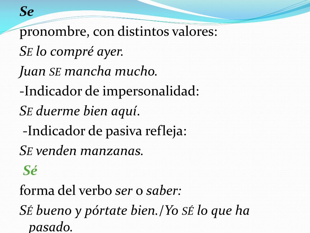 Se pronombre, con distintos valores: Se lo compré ayer. Juan se mancha mucho. -Indicador de impersonalidad: Se duerme bien aquí. -Indicador de pasiva refleja: Se venden manzanas. Sé forma del verbo ser o saber: Sé bueno y pórtate bien./Yo sé lo que ha pasado.