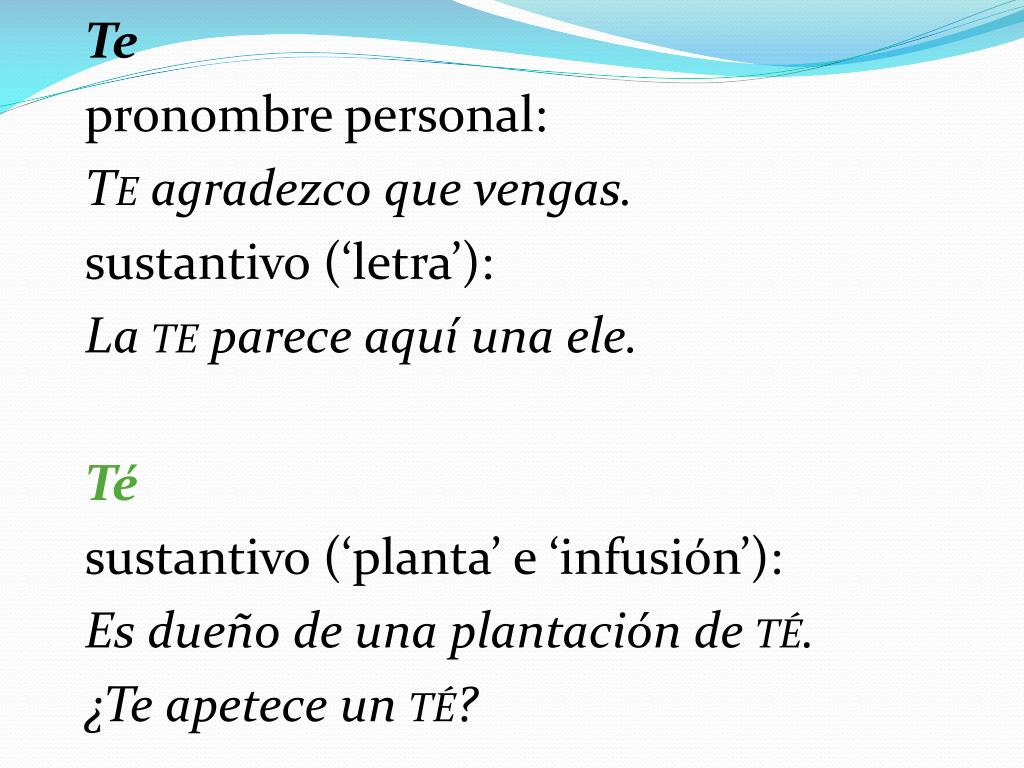 Te pronombre personal: Te agradezco que vengas. sustantivo (‘letra’): La te parece aquí una ele. Té sustantivo (‘planta’ e ‘infusión’): Es dueño de una plantación de té. ¿Te apetece un té?