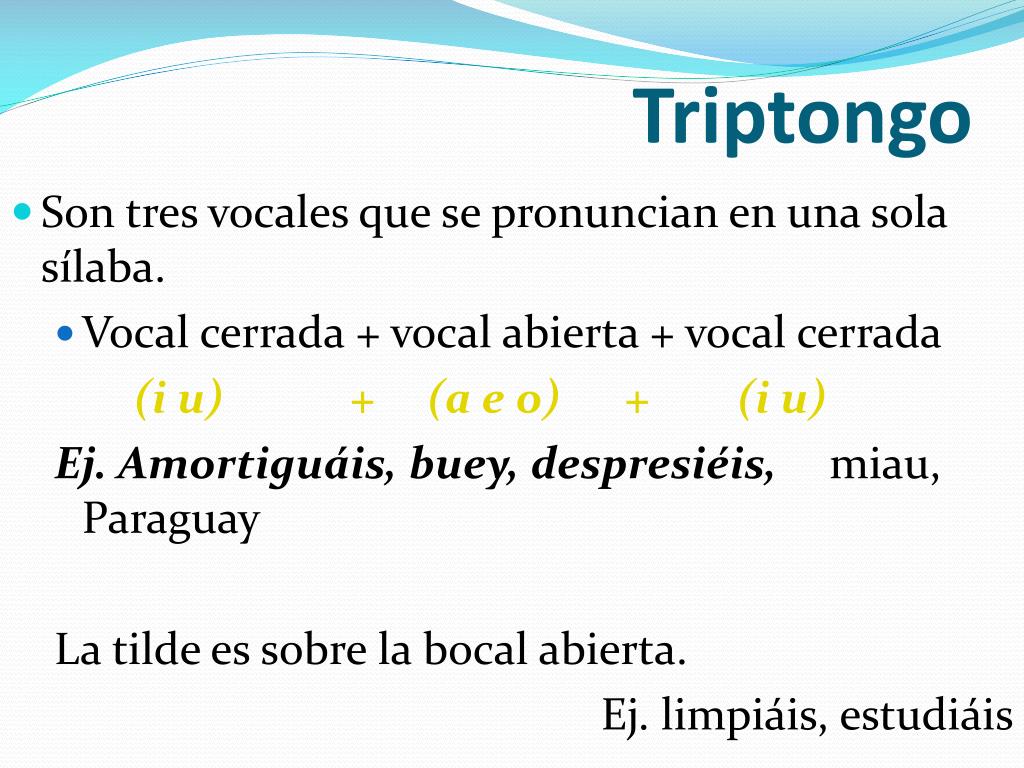 Triptongo • Son tres vocales que se pronuncian en una sola sílaba. • Vocal cerrada + vocal abierta + vocal cerrada (i u) + (a e o) + (i u) Ej. Amortiguáis,buey, despresiéis, miau, Paraguay La tilde es sobre la bocal abierta. Ej. limpiáis, estudiáis