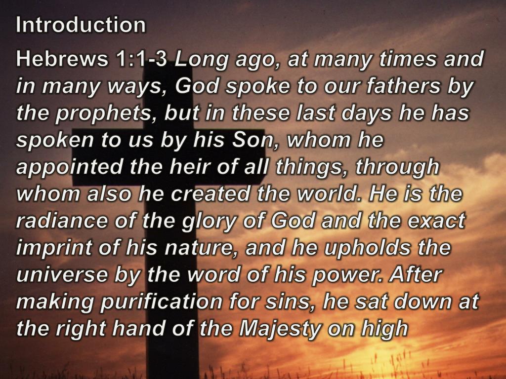 Introduction Hebrews 1:1-3 Long ago, at many times and in many ways, God spoke to our fathers by the prophets, but in these last days he has spoken to us by his Son, whom he appointed the heir of all things, through whom also he created the world. He is the radiance of the glory of God and the exact imprint of his nature, and he upholds the universe by the word of his power. After making purification for sins, he sat down at the right hand of the Majesty on high