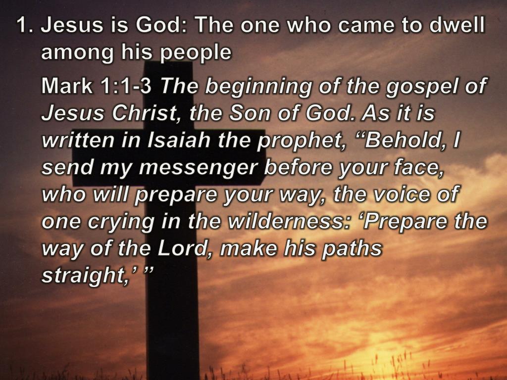 1. Jesus is God: The one who came to dwell among his people Mark 1:1-3 The beginning of the gospel of Jesus Christ, the Son of God. As it is written in Isaiah the prophet, “Behold, I send my messenger before your face, who will prepare your way, the voice of one crying in the wilderness: ‘Prepare the way of the Lord, make his paths straight,’ ”