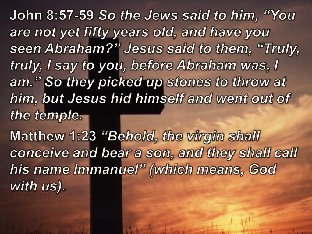 John 8:57-59 So the Jews said to him, “You are not yet fifty years old, and have you seen Abraham?” Jesus said to them, “Truly, truly, I say to you, before Abraham was, I am.” So they picked up stones to throw at him, but Jesus hid himself and went out of the temple. Matthew 1:23 “Behold, the virgin shall conceive and bear a son, and they shall call his name Immanuel” (which means, God with us).
