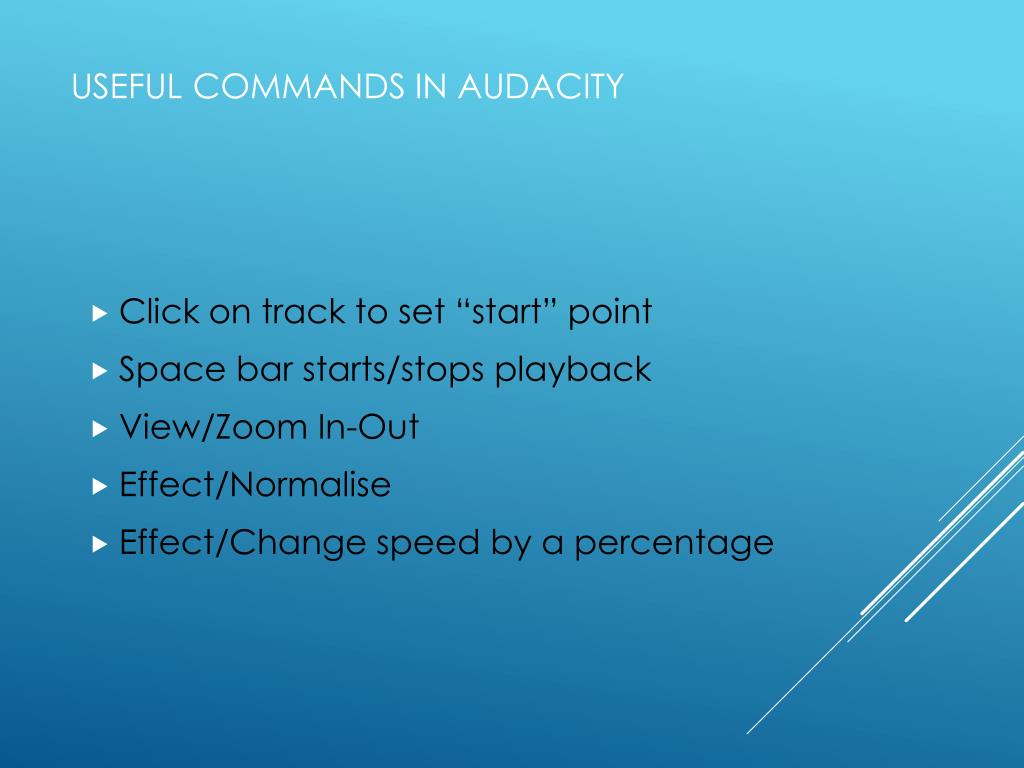 Click on track to set “start” point • Space bar starts/stops playback • View/Zoom In-Out • Effect/Normalise • Effect/Change speed by a percentage Useful commands in audacity