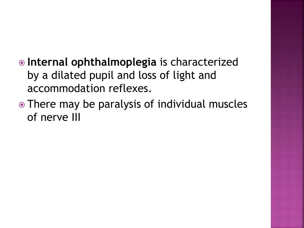 Internal ophthalmoplegiais characterized by a dilated pupil and loss of light and accommodation reflexes. • There may be paralysis of individual muscles of nerve III