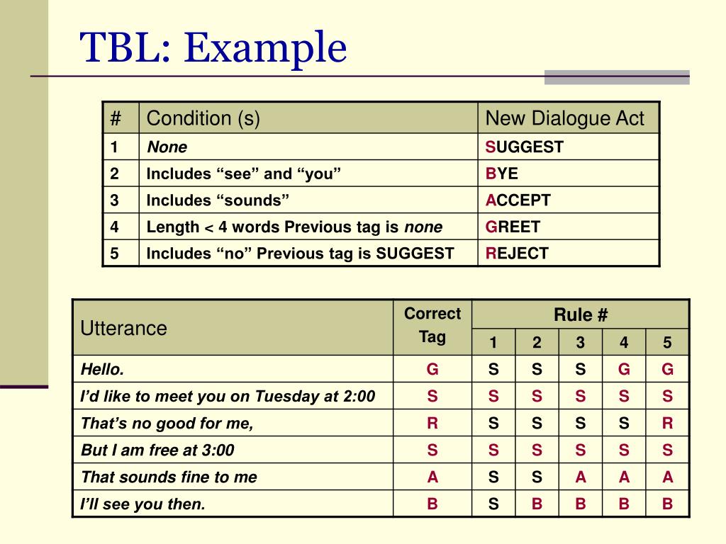 Outline • Dialogue Acts • Transformation Based Learning (TBL) • Introduction • Training Phase • Example • Motivation for use of TBL in Dialogue • Limitations of TBL • Monte Carlo Version of TBL • Other Extensions • References