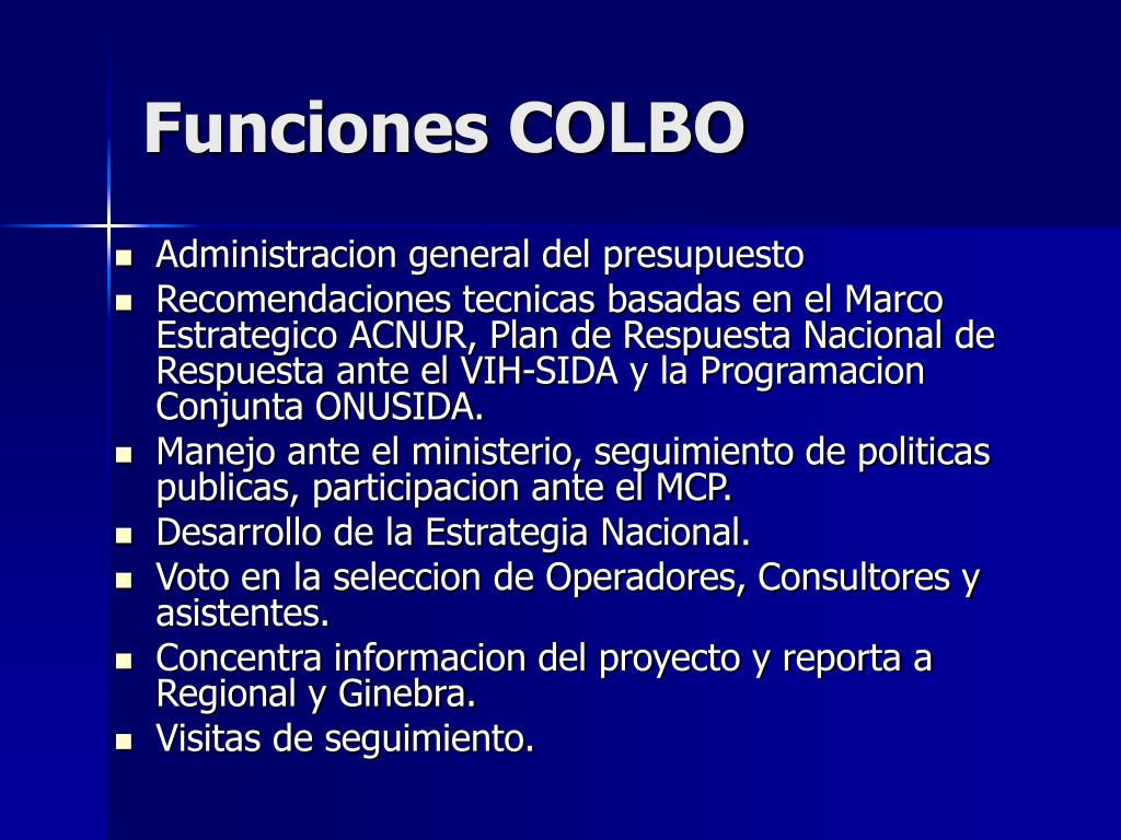 Funciones COLBO • Administracion general del presupuesto • Recomendaciones tecnicas basadas en el Marco Estrategico ACNUR, Plan de Respuesta Nacional de Respuesta ante el VIH-SIDA y la Programacion Conjunta ONUSIDA. • Manejo ante el ministerio, seguimiento de politicas publicas, participacion ante el MCP. • Desarrollo de la Estrategia Nacional. • Voto en la seleccion de Operadores, Consultores y asistentes. • Concentra informacion del proyecto y reporta a Regional y Ginebra. • Visitas de seguimiento.