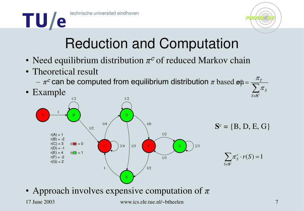 Reduction and Computation • Need equilibrium distribution πc of reduced Markov chain • Theoretical result • πccan be computed from equilibrium distribution π based on • Example • Approach involves expensive computation of π Sc = {B, D, E, G} www.ics.ele.tue.nl/~btheelen