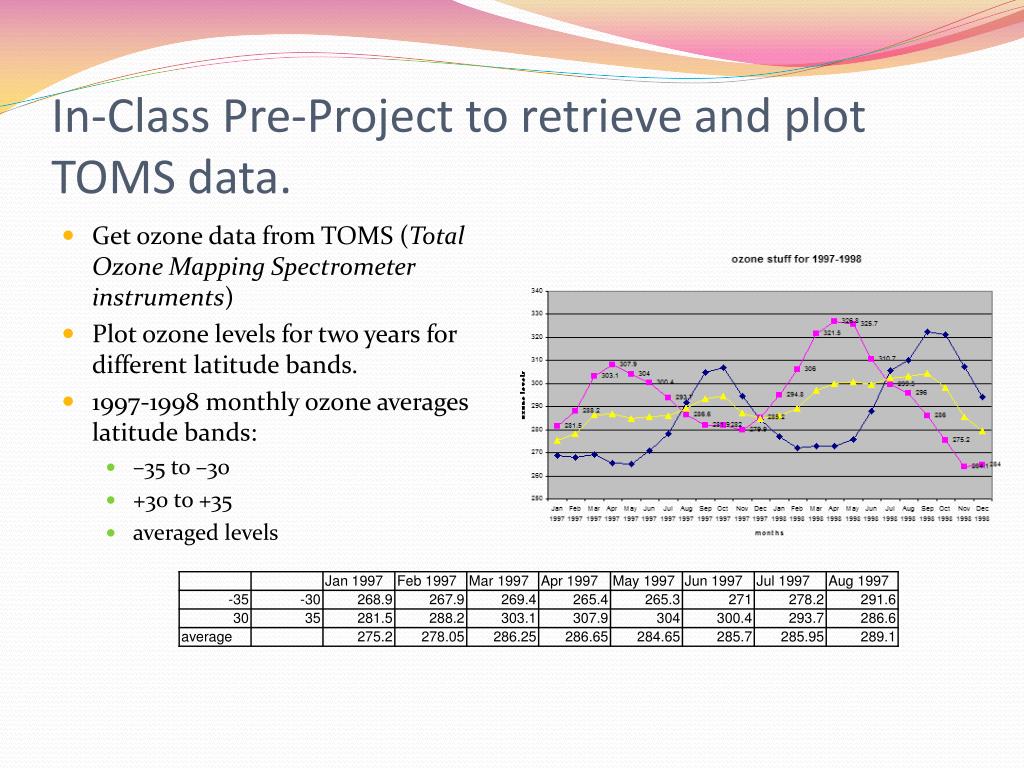 In-Class Pre-Project to retrieve and plot TOMS data. • Get ozone data from TOMS (Total Ozone Mapping Spectrometer instruments) • Plot ozone levels for two years for different latitude bands. • 1997-1998 monthly ozone averages latitude bands: • –35 to –30 • +30 to +35 • averaged levels