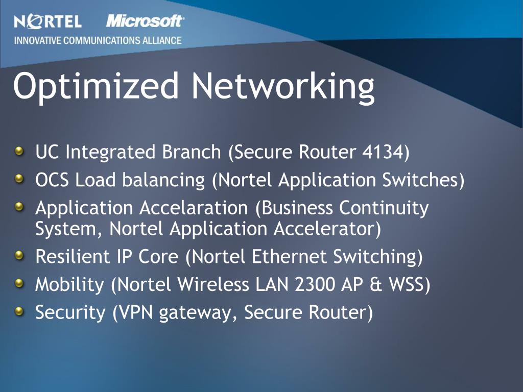 Optimized Networking UC Integrated Branch (Secure Router 4134) OCS Load balancing (Nortel Application Switches) Application Accelaration (Business Continuity System, Nortel Application Accelerator) Resilient IP Core (Nortel Ethernet Switching) Mobility (Nortel Wireless LAN 2300 AP & WSS) Security (VPN gateway, Secure Router)