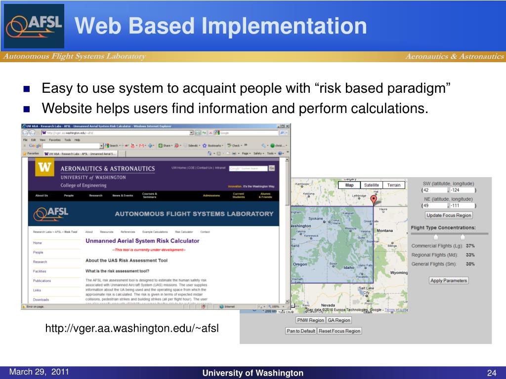 Web Based Implementation • Easy to use system to acquaint people with “risk based paradigm” • Website helps users find information and perform calculations. http://vger.aa.washington.edu/~afsl University of Washington