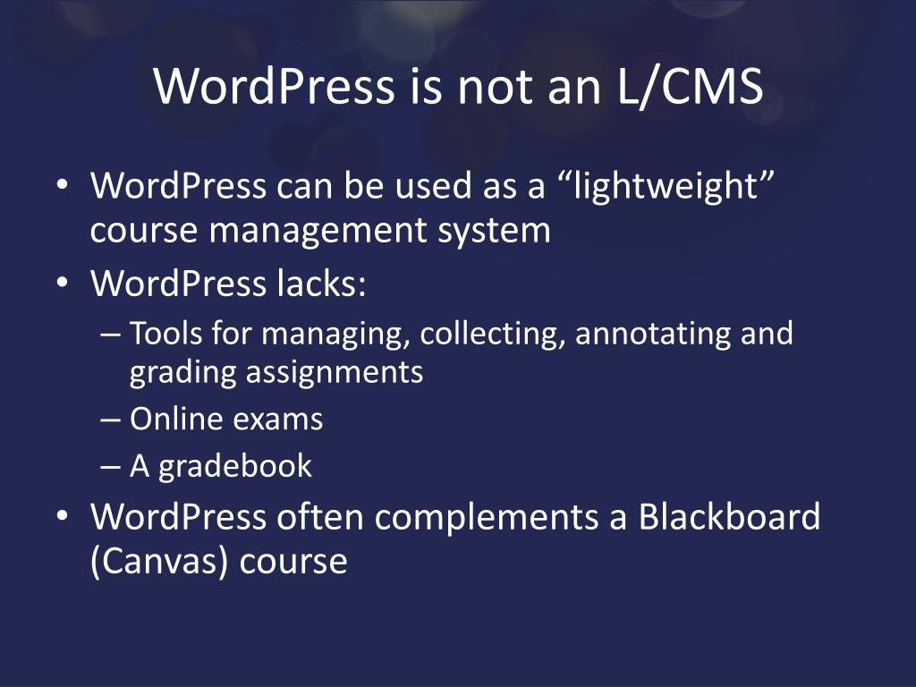 WordPress is not an L/CMS • WordPress can be used as a “lightweight” course management system • WordPress lacks: • Tools for managing, collecting, annotating and grading assignments • Online exams • A gradebook • WordPressoften complements a Blackboard (Canvas) course