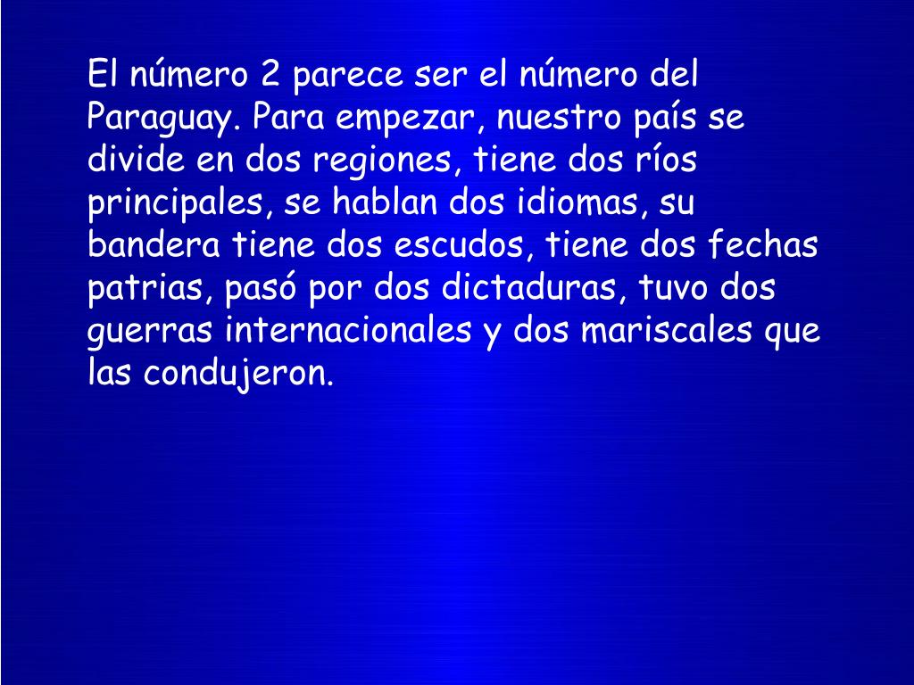 El número 2 parece ser el número del Paraguay. Para empezar, nuestro país se divide en dos regiones, tiene dos ríos principales, se hablan dos idiomas, su bandera tiene dos escudos, tiene dos fechas patrias, pasó por dos dictaduras, tuvo dos guerras internacionales y dos mariscales que las condujeron.