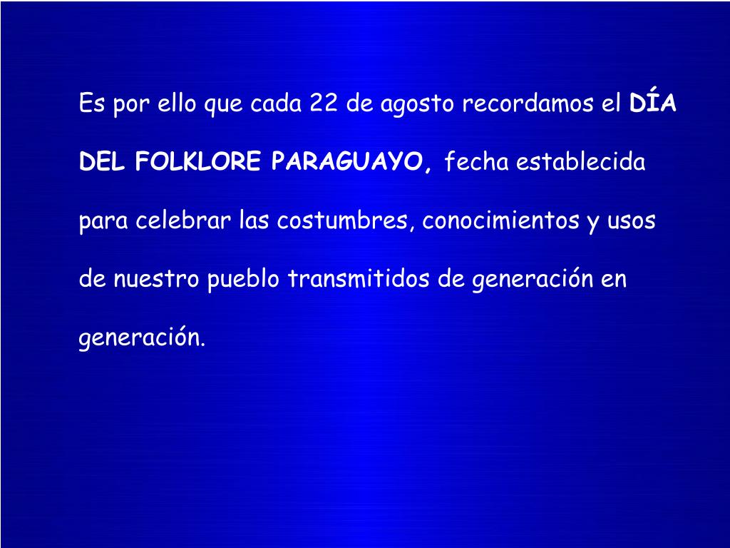 *DIA DEL FOLKLORE PARAGUAYO* El Paraguay es uno de los países con mayor y más rica TRADICIÓN FOLKLÓRICA en el mundo; posee un inmenso caudal de SABIDURÍA POPULAR que pervive a través del tiempo gracias a la MEMORIA COLECTIVA, que unifica a todos los paraguayos en un mismo sentir, pensar y actuar, vivificando nuestras raíces históricas.