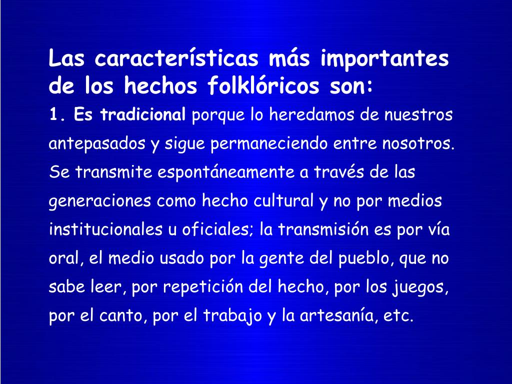 Las características más importantes de los hechos folklóricos son: 1. Es tradicional porque lo heredamos de nuestros antepasados y sigue permaneciendo entre nosotros. Se transmite espontáneamente a través de las generaciones como hecho cultural y no por medios institucionales u oficiales; la transmisión es por vía oral, el medio usado por la gente del pueblo, que no sabe leer, por repetición del hecho, por los juegos, por el canto, por el trabajo y la artesanía, etc.