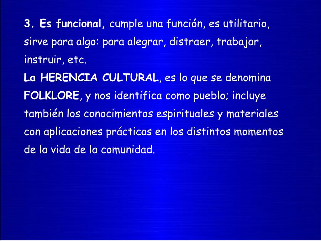 3. Es funcional, cumple una función, es utilitario, sirve para algo: para alegrar, distraer, trabajar, instruir, etc. La HERENCIA CULTURAL, es lo que se denomina FOLKLORE, y nos identifica como pueblo; incluye también los conocimientos espirituales y materiales con aplicaciones prácticas en los distintos momentos de la vida de la comunidad.
