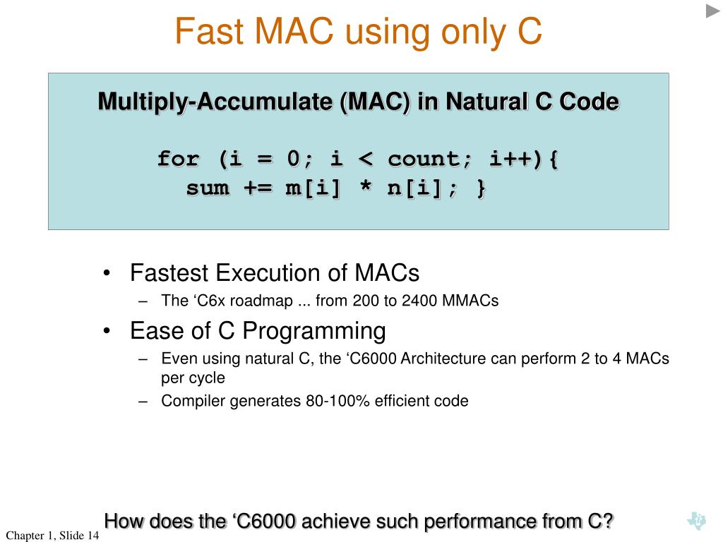Fast MAC using only C Multiply-Accumulate (MAC) in Natural C Code for (i = 0; i < count; i++){ sum += m[i] * n[i]; } • Fastest Execution of MACs • The ‘C6x roadmap ... from 200 to 2400 MMACs • Ease of C Programming • Even using natural C, the ‘C6000 Architecture can perform 2 to 4 MACs per cycle • Compiler generates 80-100% efficient code How does the ‘C6000 achieve such performance from C?