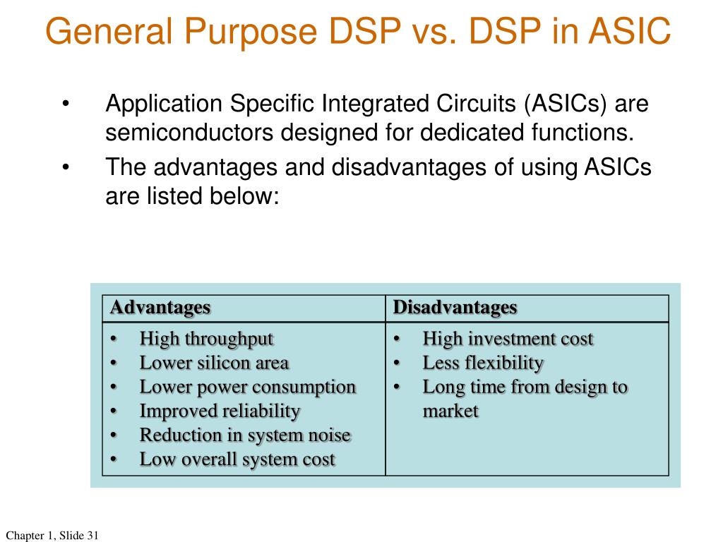 General Purpose DSP vs. DSP in ASIC • Application Specific Integrated Circuits (ASICs) are semiconductors designed for dedicated functions. • The advantages and disadvantages of using ASICs are listed below: Advantages Disadvantages • High throughput • Lower silicon area • Lower power consumption • Improved reliability • Reduction in system noise • Low overall system cost • High investment cost • Less flexibility • Long time from design to market