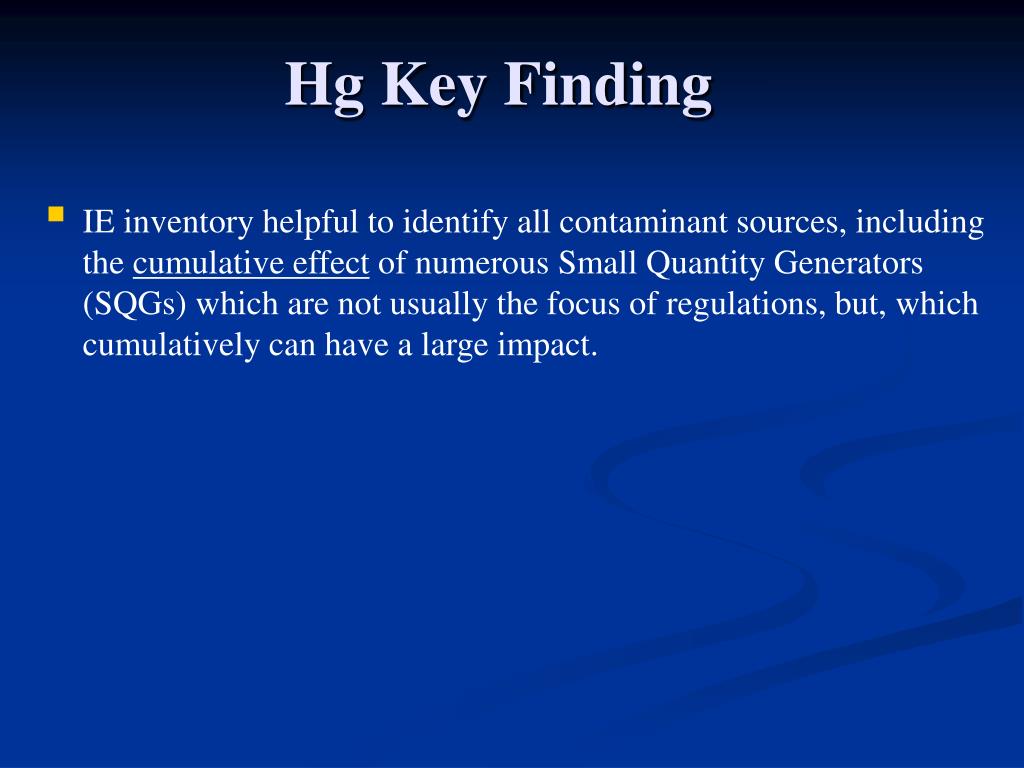 Hg Key Finding • IE inventory helpful to identify all contaminant sources, including the cumulative effect of numerous Small Quantity Generators (SQGs) which are not usually the focus of regulations, but, which cumulatively can have a large impact.