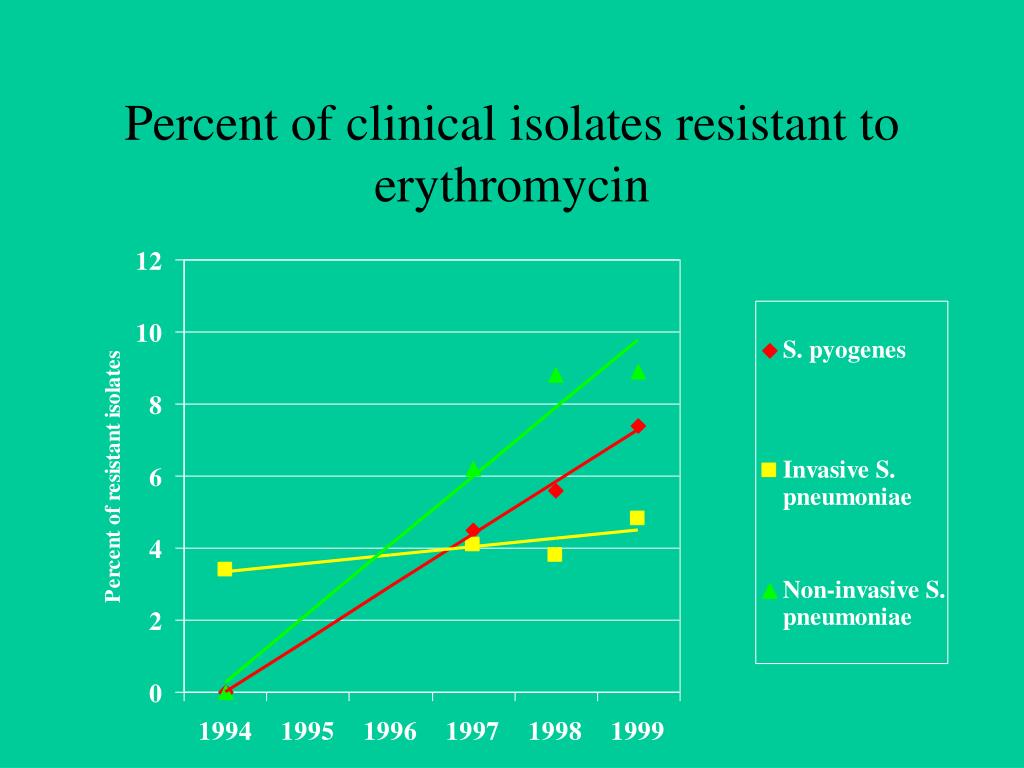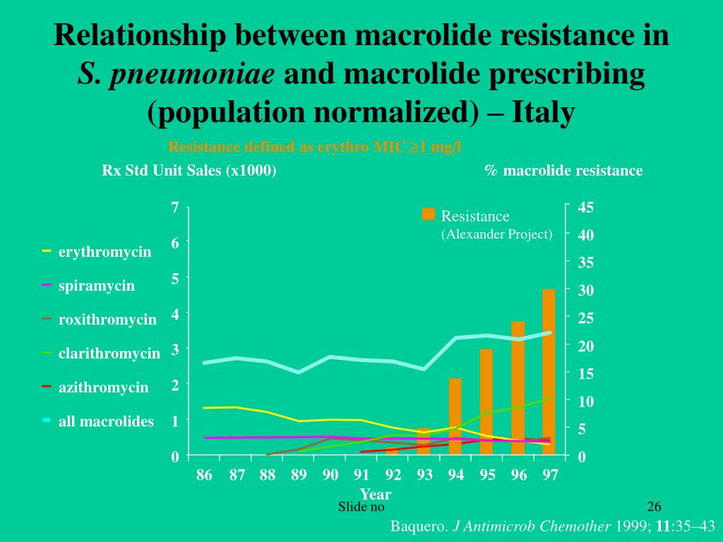 Relationship between macrolide resistance in S. pneumoniae and macrolide prescribing (population normalized) – Italy Resistance defined as erythro MIC ³1 mg/l Rx Std Unit Sales (x1000) % macrolide resistance 7 45 Resistance (Alexander Project) 40 6 erythromycin 35 5 spiramycin 30 4 25 roxithromycin 20 3 clarithromycin 15 2 azithromycin 10 all macrolides 1 5 0 0 86 87 88 89 90 91 92 93 94 95 96 97 Year Slide no Baquero. J Antimicrob Chemother 1999; 11:35–43