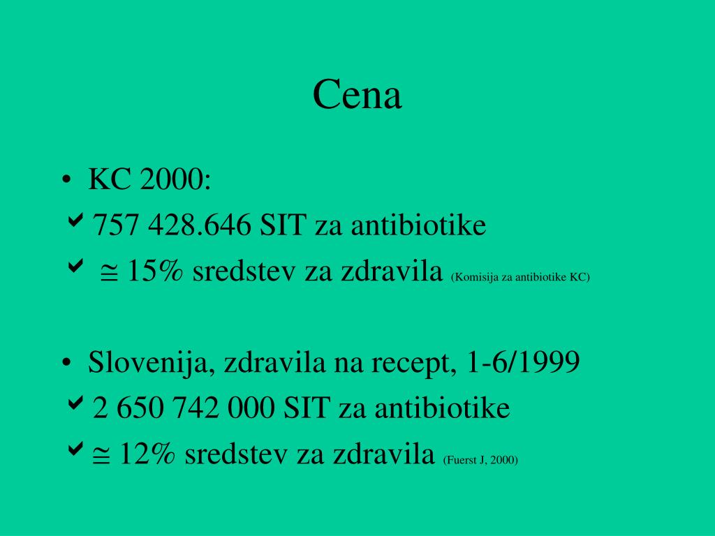 Cena • KC 2000: • 757 428.646 SIT za antibiotike • 15% sredstev za zdravila (Komisija za antibiotike KC) • Slovenija, zdravila na recept, 1-6/1999 • 2 650 742 000 SIT za antibiotike • 12% sredstev za zdravila (Fuerst J, 2000)