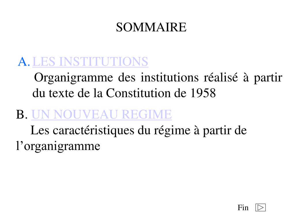 SOMMAIRE • LES INSTITUTIONS Organigramme des institutions réalisé à partir du texte de la Constitution de 1958 B. UN NOUVEAU REGIME Les caractéristiques du régime à partir de l’organigramme Fin