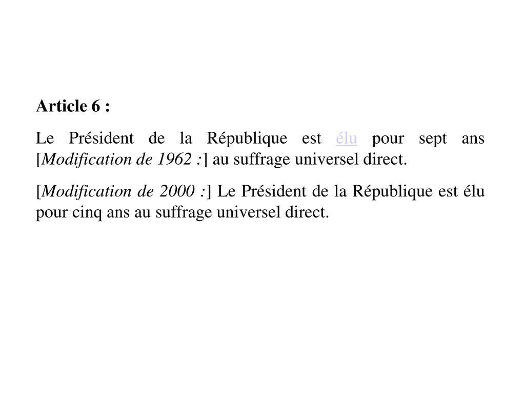 Article 6 : Le Président de la République est élu pour sept ans [Modification de 1962 :] au suffrage universel direct. [Modification de 2000:] Le Président de la République est élu pour cinq ans au suffrage universel direct.