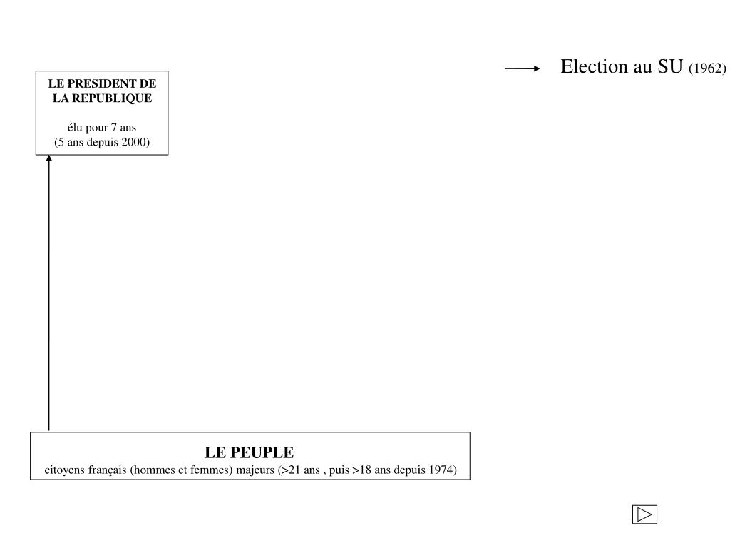 Election au SU (1962) LE PRESIDENT DE LA REPUBLIQUE Nomination élu pour 7 ans (5 ans depuis 2000) GOUVERNEMENT Premier Ministre + Ministres (sur proposition du Premier ministre) LE PEUPLE citoyens français (hommes et femmes) majeurs (>21 ans , puis >18 ans depuis 1974)
