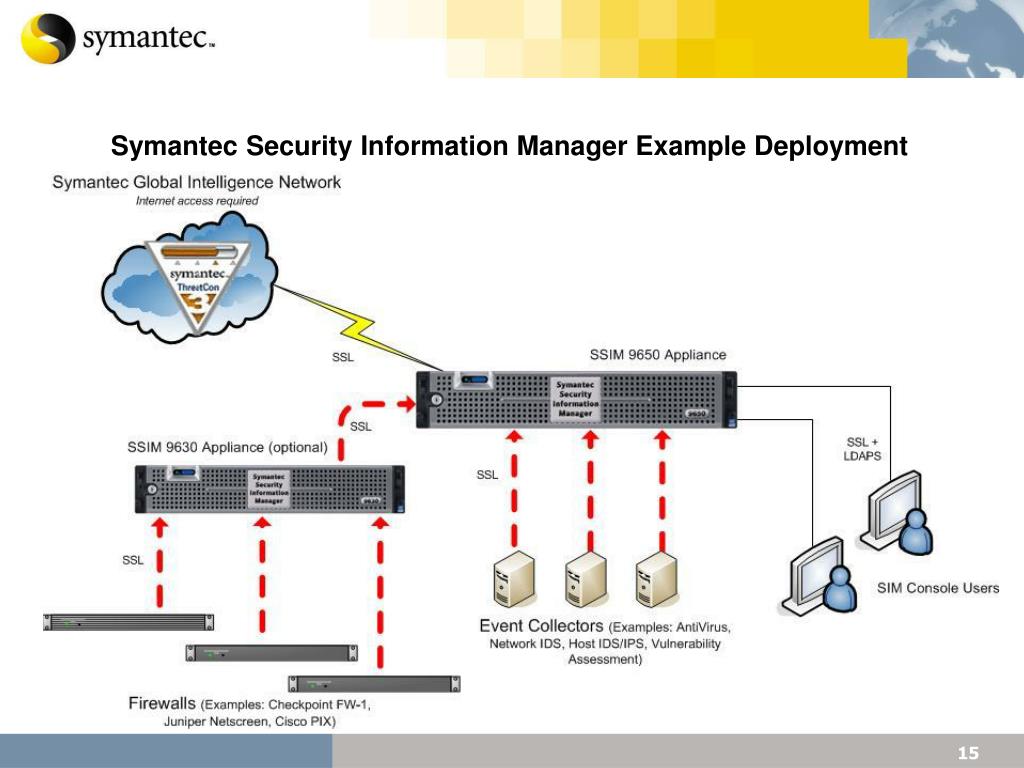 Flexible Options and Easy Deployment Symantec Security Information Manager Appliance Models • Correlation Model 9650 • Required to normalize, filter, aggregate, correlate, store, monitor, and manage all tiers of the network infrastructure • Collection Model 9630 • Optional model to normalize, filter, aggregate firewall, IDS, integrated security events • Both models include agent-less collectors for CheckPoint, Cisco PIX, Juniper NetScreen, SNORT, Generic Syslog and more.