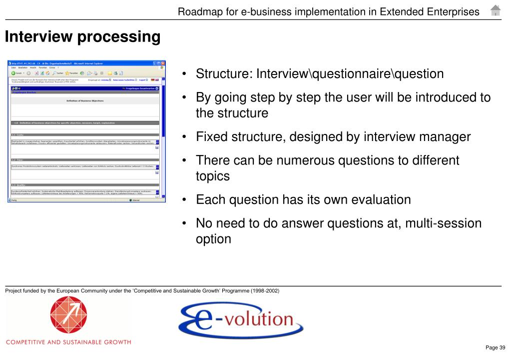 The e-volution concept - successful implementation of e-business in Extended Enterprises e-business road mapping methodology Software tools Based on approved models, e-volution offers an e-business road mappingmethodology that fulfils the requirements of a systematic and goal-oriented planning of e-business implementation. The methodology is the starting point for the use of phase specific, supporting software tools. Training package Content Service The e-volution training package is for transfer and teaching how to apply the e-business road mapping model, methods and tools. The e-volution Content Service disseminates the e-business road mapping model with its methods and tools but also know-how about e-business.