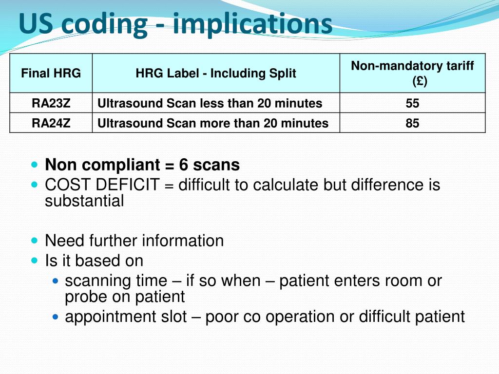 US coding - implications • Non compliant = 6 scans • COST DEFICIT = difficult to calculate but difference is substantial • Need further information • Is it based on • scanning time – if so when – patient enters room or probe on patient • appointment slot – poor co operation or difficult patient