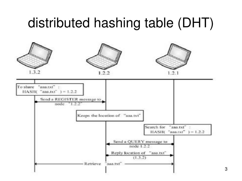 distributed hashing table (DHT) • Logic address is used as the node id (key) of the P2P system • a node uses the filename or some keywords as the input to a hash function • output of the hash function, called a key, will correspond to the logic address of a mobile node which will be responsible for storing the information of the shared object