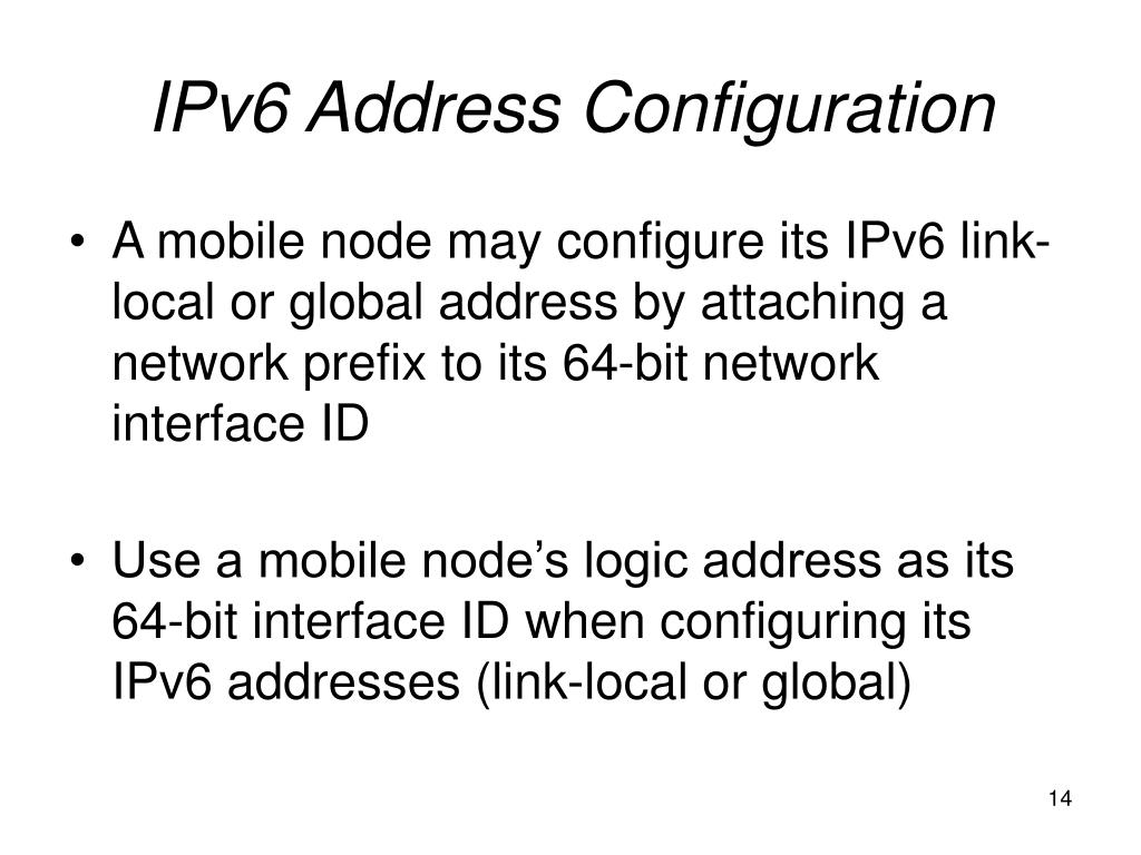 IPv6 Address Configuration • A mobile node may configure its IPv6 link-local or global address by attaching a network prefix to its 64-bit network interface ID • Use a mobile node’s logic address as its 64-bit interface ID when configuring its IPv6 addresses (link-local or global)