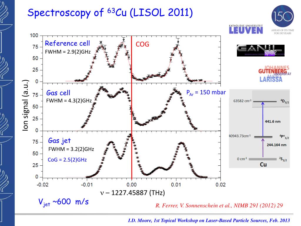 LARISSA Spectroscopy of 63Cu (LISOL 2011) Reference cell COG FWHM = 2.9(2)GHz Ionsignal (a.u.) PAr= 150 mbar Gas cell FWHM = 4.3(2)GHz Gas jet FWHM = 3.2(2)GHz CoG = 2.5(2)GHz n – 1227.45887 (THz) Vjet ~600 m/s R. Ferrer, V. Sonnenschein et al., NIMB 291 (2012) 29 I.D. Moore, 1st Topical Workshop on Laser-BasedParticleSources, Feb. 2013